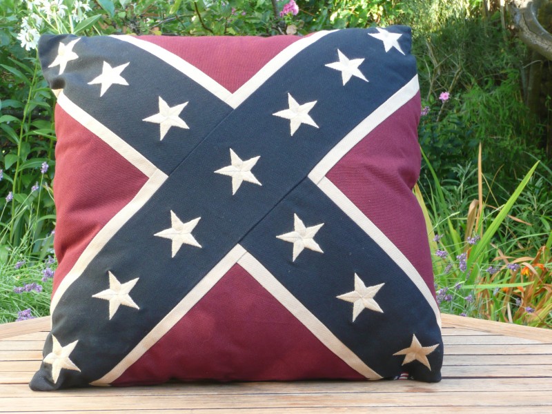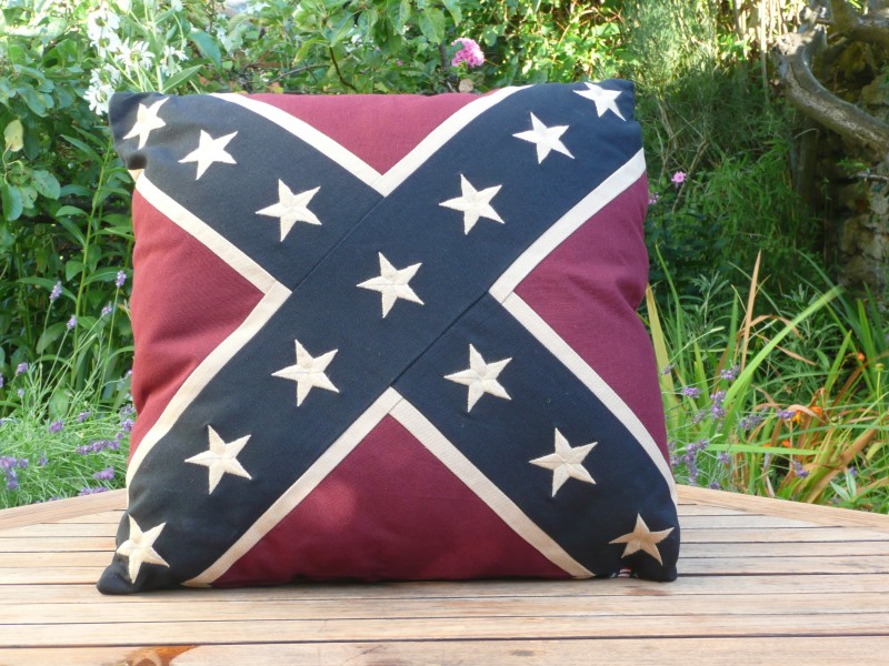 Rebel Confederate Cushion with design made up of individual pieces of material. The design is featured on both sides of the cushion which measures 18" square (one size only). A zip runs along one edge to allow removal of the filler. The cushion is sold complete with a polyester filler.