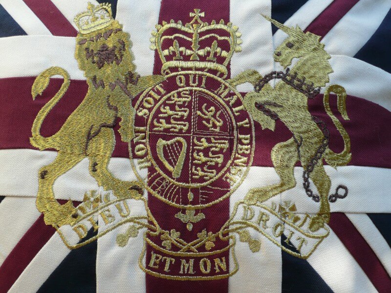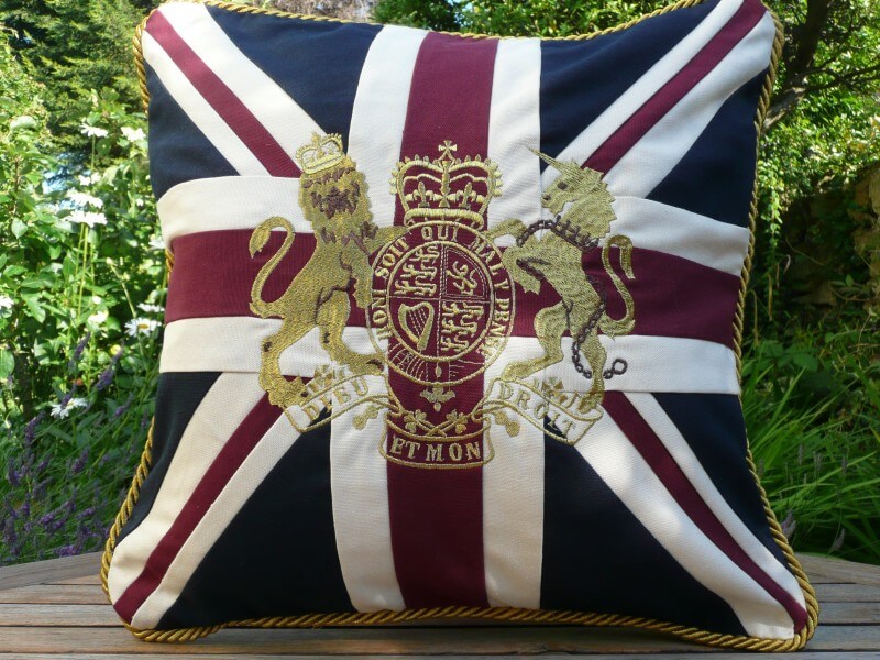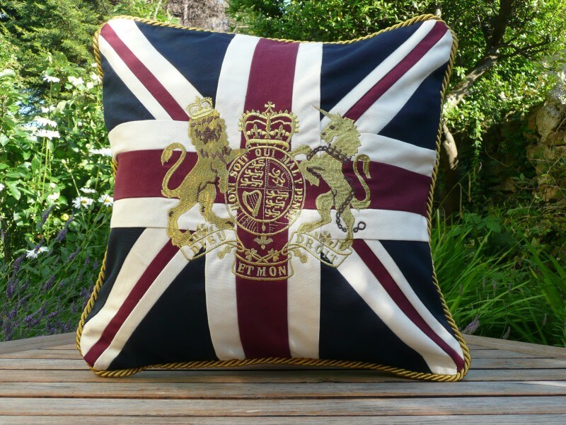 Union Jack cushion with the Royal Crest embroidered in the centre in fine gold thread.On the reverse the cushion is plain maroon and navy, with an opening for the filler. Cushion measures 18" (46 cm) square (available in one size only) and is supplied with a polyester filling.