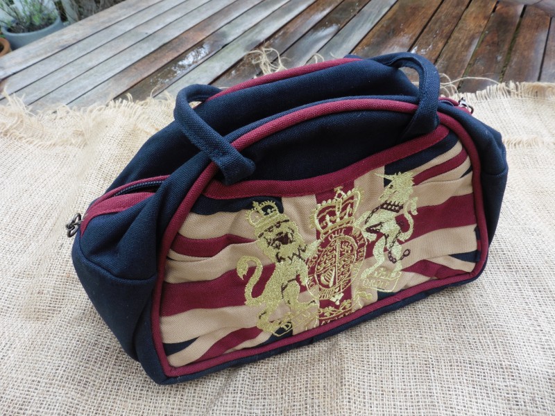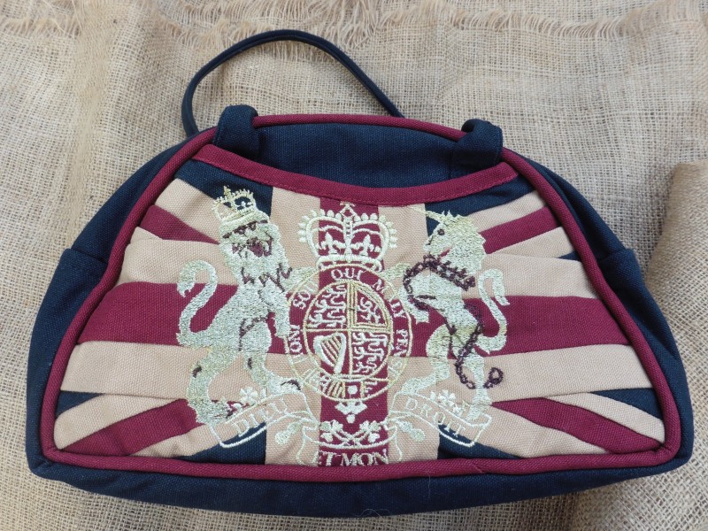 Union Jack handbag featuring a Royal Crest design in gold embroidery on both sides.