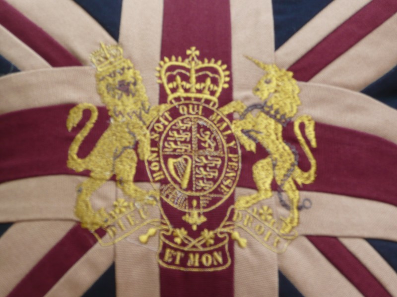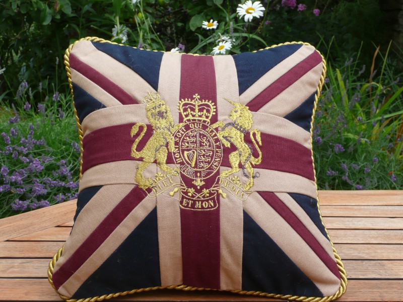 Royal Crest Vintage cushion. The Union Jack, which is made up of individual pieces of material, has a Royal Crest embroidered on it in gold thread The cushion is piped in matching gold braid. The reverse of the cushion is in plain maroon and navy blue with a "hidden" zip to allow removal of the filler for cleaning. The cushion comes complete with a polyester filler.