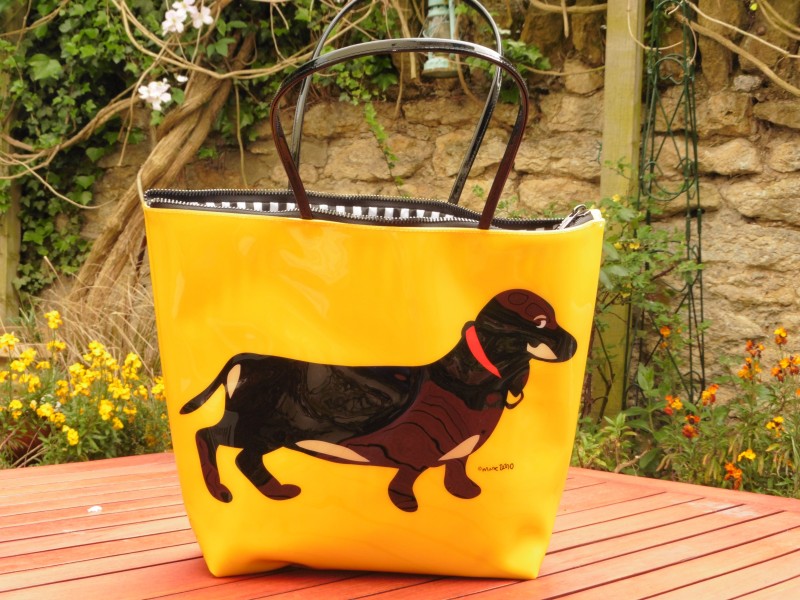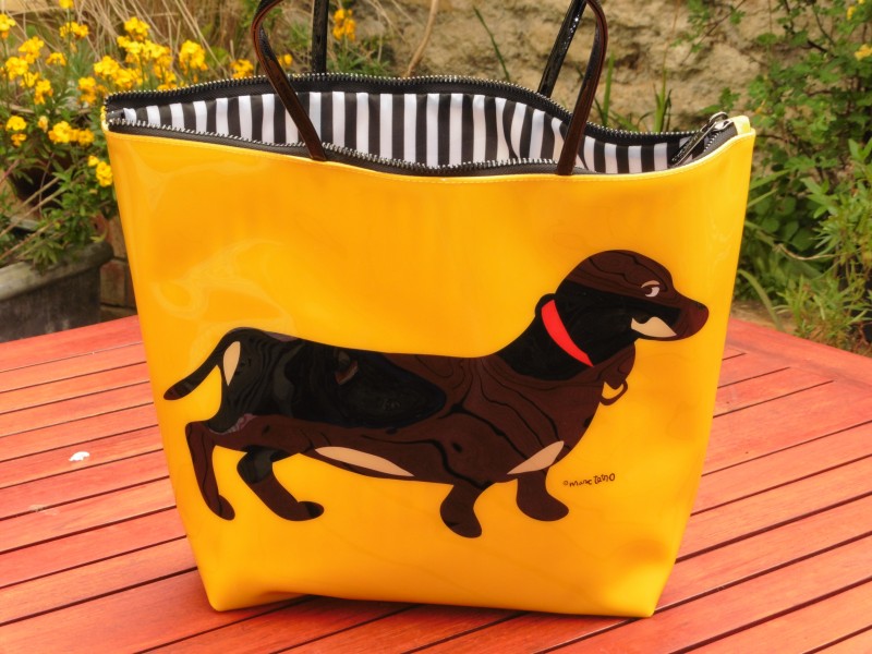 Sausage Dog (Dachshund) Designed tote / shoulder bag by Marco Tetro. Made in shiny PVC featuring a cute Black Dachshund with a red collar, against a brilliant yellow background. The bag has a sturdy zip closure and is fully lined in a lovely black and white striped material.