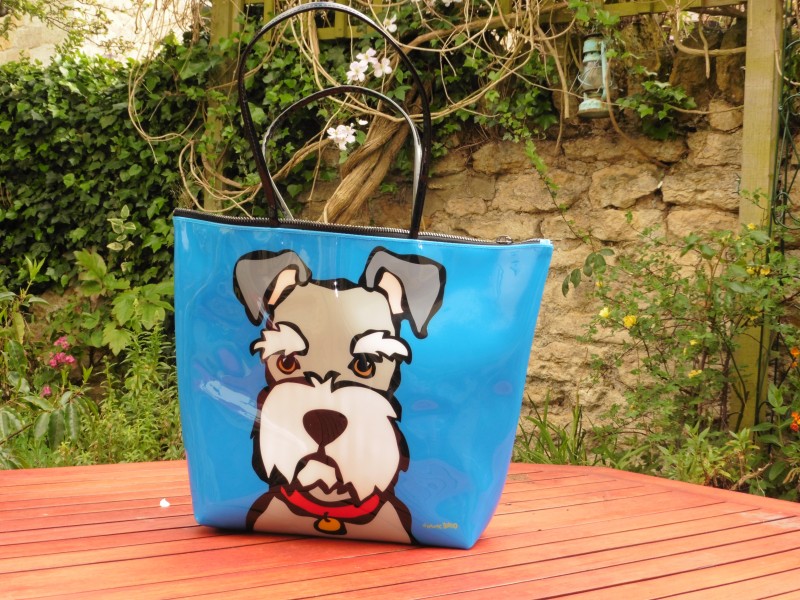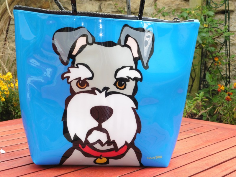 Schnauzer tote / shoulder bag by Marco Tetro. Made in shiny PVC featuring a cute Grey Schnauzer dog (with white eyebrows and white muzzle). He is wearing a red collar and is featured against a brilliant sky blue background. The bag has a sturdy zip closure and is fully lined in a lovely black and white striped material.