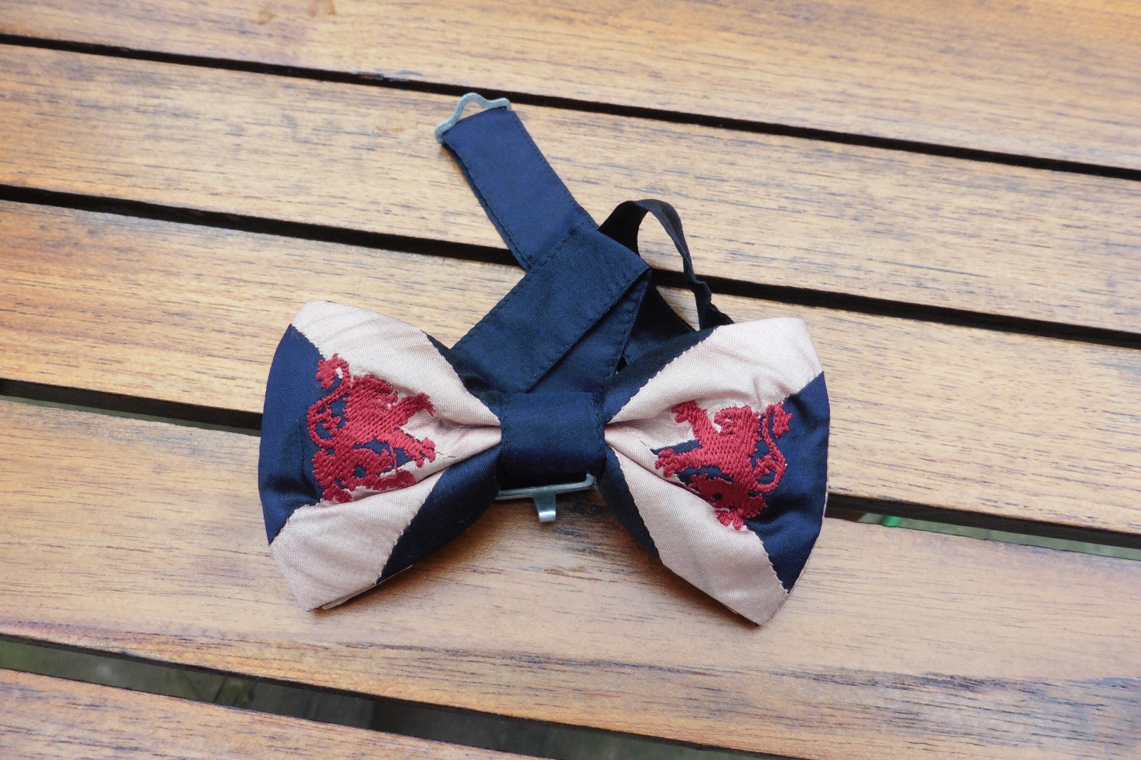 Scottish Lion Rampant Silk Bow Tie - Ready tied in vintage colours.. The neck band can be shortened or lengthened to suit to suit ones individual size.