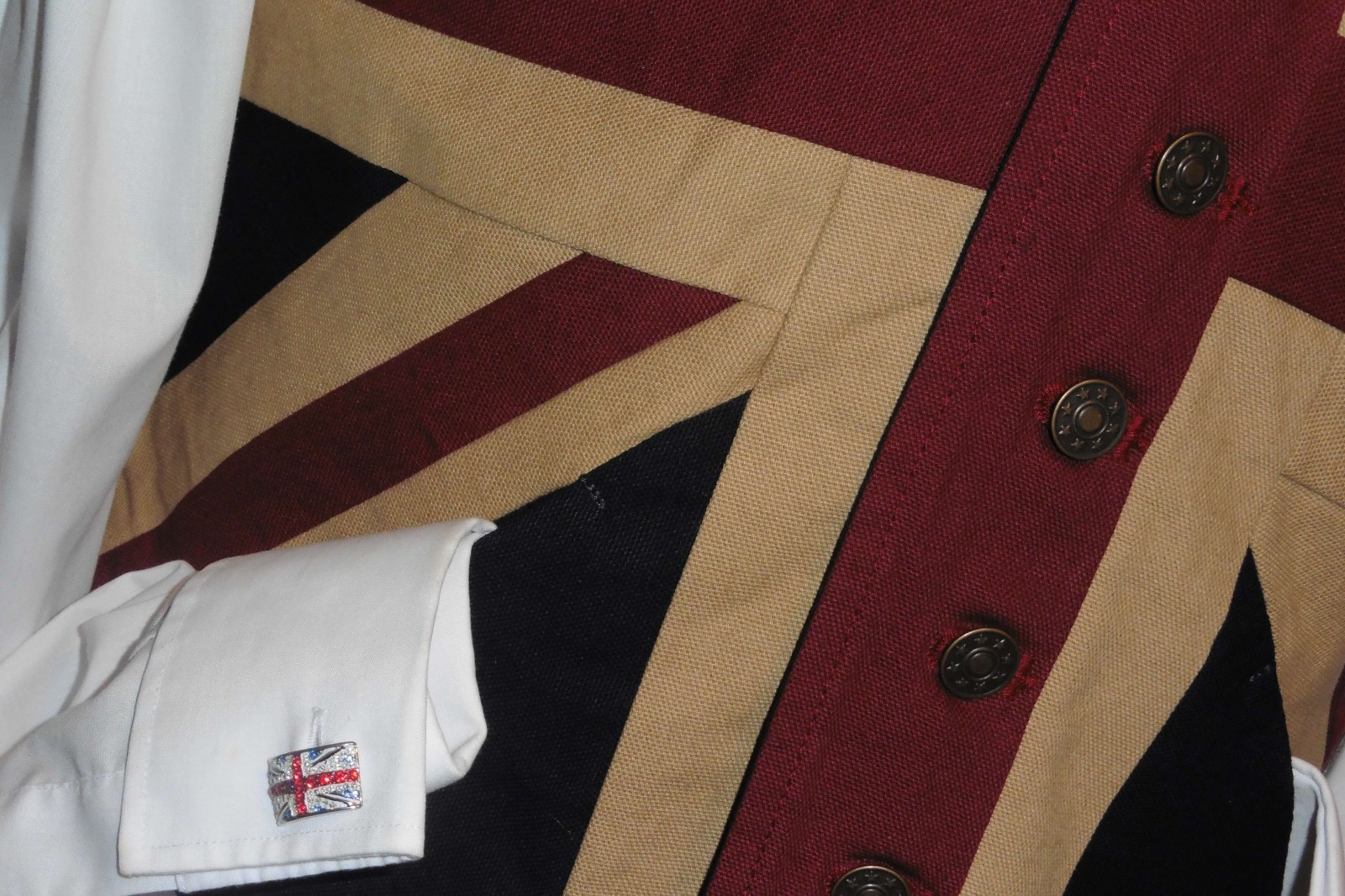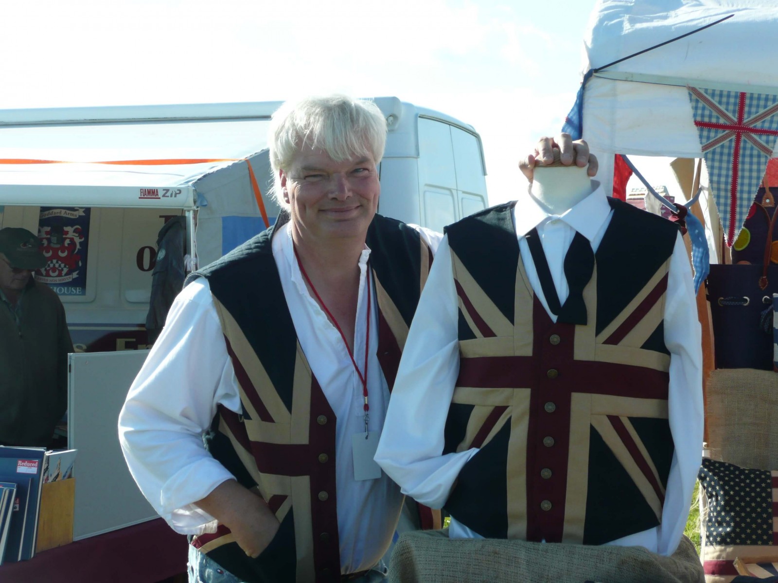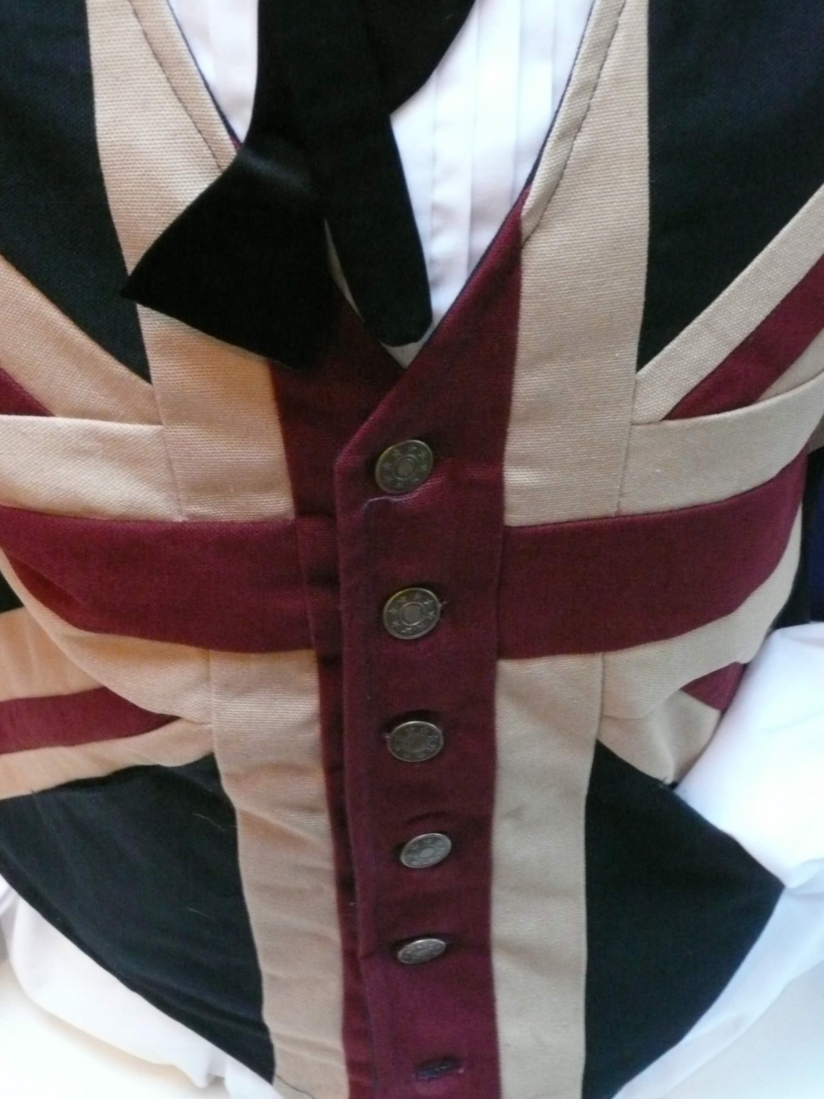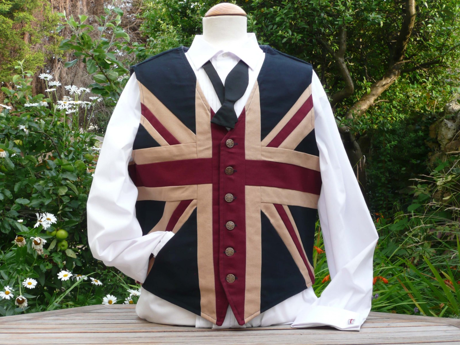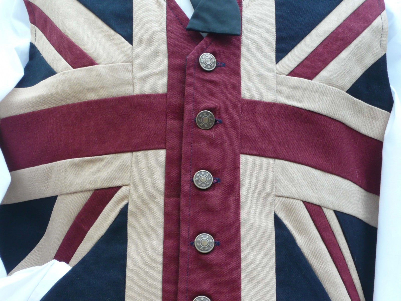 Our well known Vintage Union Jack Waistcoat - Available in sizes to fit from a 38 " chest up to a 56" chest. This waistcoat is based upon a Union Jack design made up of individual pieces of material rather than simply printed. The waistcoat is buttoned with antique metal style buttons and has subtle pockets on the front. The back is lightly padded for comfort and is in plain blue with an adjustor strap. The inside lining can vary but is usually in a tartan material