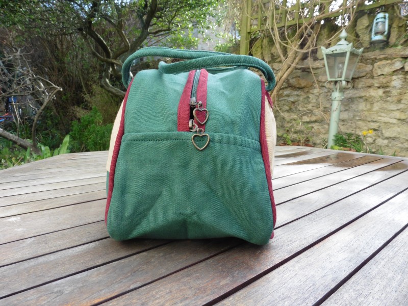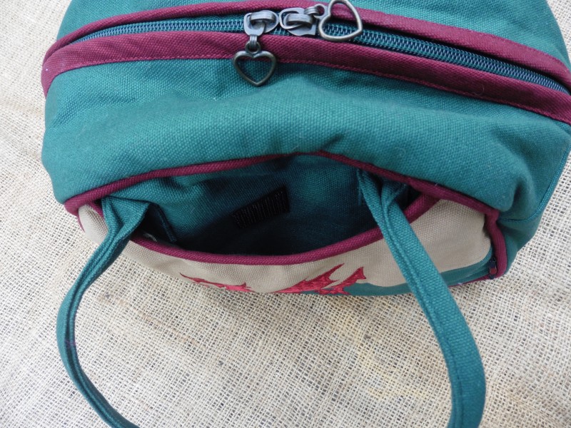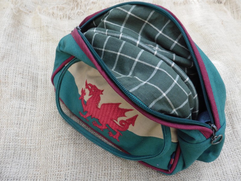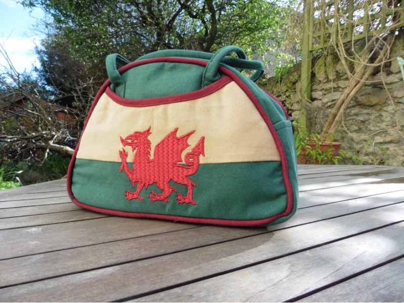 Fabulous, unique Welsh Handbag. Made of tea dyed hard wearing cotton featuring the Welsh dragon. The bag has two velcro fastened pockets on the outside and two zipped pockets in the interior which is fully lined, normally in a green check cotton. The bag is closed by a zip that runs along the top of the bag - or alternatively meets in the middle from both ends. The bag measures c. 12" x 7" across the base and stands c 7.5" high, although, as these bags are hand made the exact measurements may vary slightly.