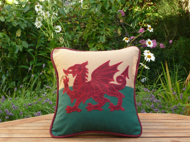Welsh Mini Cushion measuring 12" x 12". The cushion features the Welsh Dragon in red applique on both sides. A subtle zip along one edge allows removal of the filler for cleaning. The cushion comes with a polyester filler